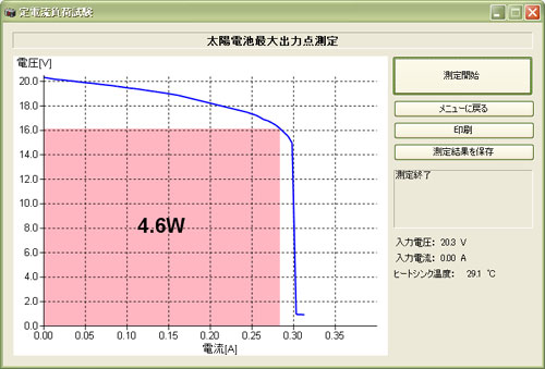 太陽電池は負荷の電流によって電圧が大きく変化し、取り出せる電力も変化します。この特性を測定して、最大の電力が取り出せる点を測定する機能です。