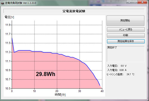 電池を一定の電流で放電し、電圧の変化を観測することで、電池から取り出せる電力量を測定する機能です。